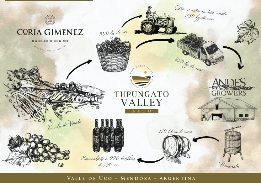 Andes Grower recibirá de la productora agrícola, 250 KG de uva por parcela, de las cuales se obtendrá en vinificación aproximadamente 170 litros de vinos, que equivaldrá de forma fraccionada a 220 botellas de 750 cc; Logrado así un acuerdo comercial de Costo industrial de producción, donde los costos unitarios logrados solo se consiguen con grandes volúmenes de uva para la vinificación.