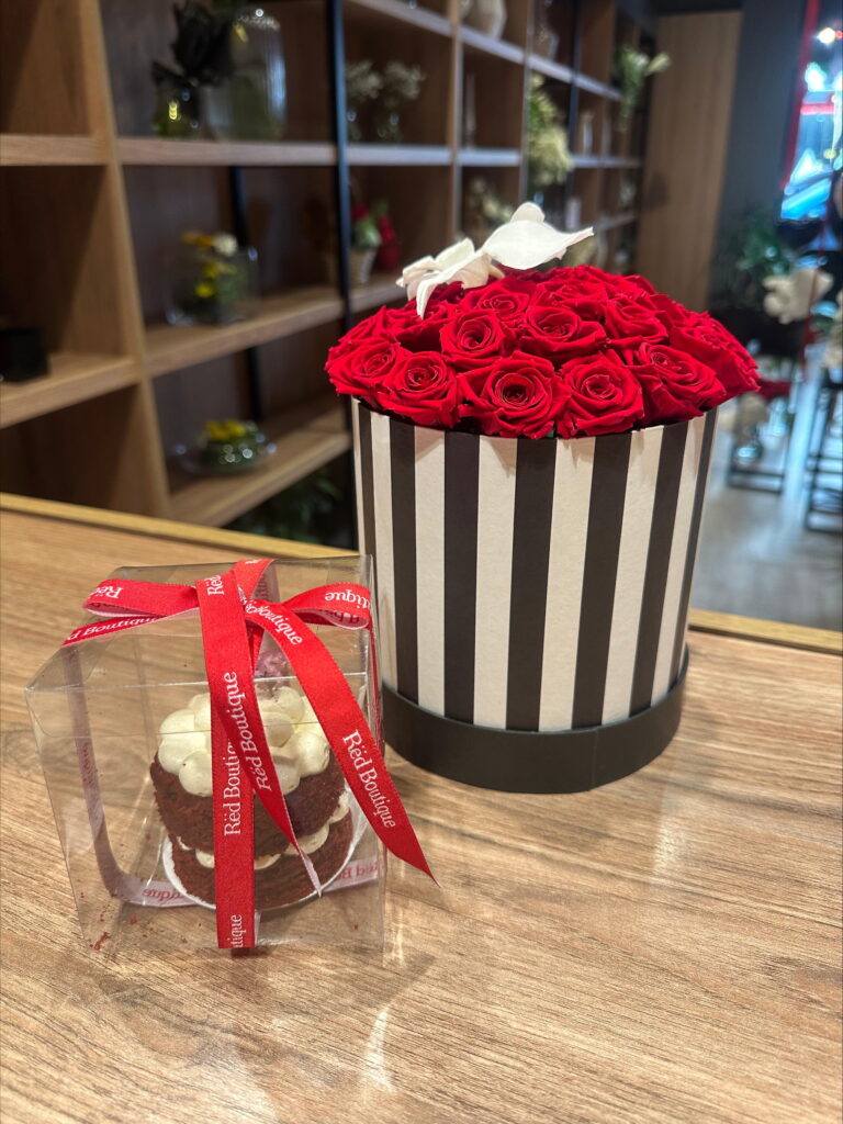 Box caja rayas byn + rosas babys preservadas + mini cake red boutique.