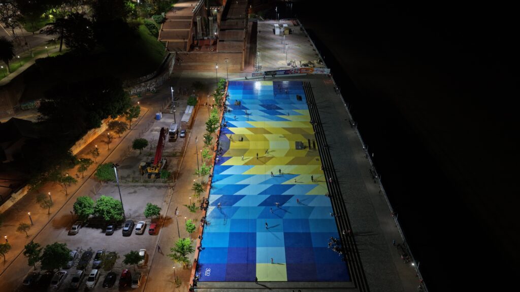 Para la realización de la obra de arte de más de 3.200 metros cuadrados se emplearon más de 1700 litros de 12 colores de pintura industrial International, especial para este tipo de superficies y usos. La obra de arte estará exigida a los desafíos que las prácticas deportivas de skate, patín y bici representan por lo tanto se requería de soluciones que ofrecieran una performance de excelencia para alto tránsito.