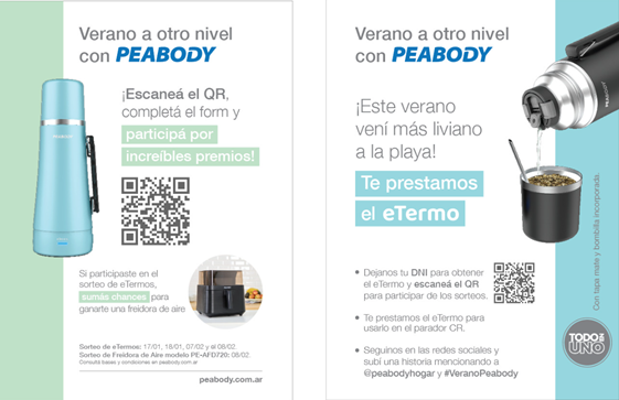 “Desde Peabody sumamos esta propuesta con experiencias vinculadas a los placeres gastronómicos, de la mano de nuestras soluciones y Chefs ejecutivos. Desde unos ricos mates de la mano del eTermo, que llegó para revolucionar la tradicional forma de compartir esta costumbre tan Argentina, hasta degustaciones de comidas especiales y saludables para compartir un momento ideal en vacaciones, con familia y amigos”, comentó María Fernanda Lota, Gerente de MKT de Goldmund SA, empresa dueña de la marca.
