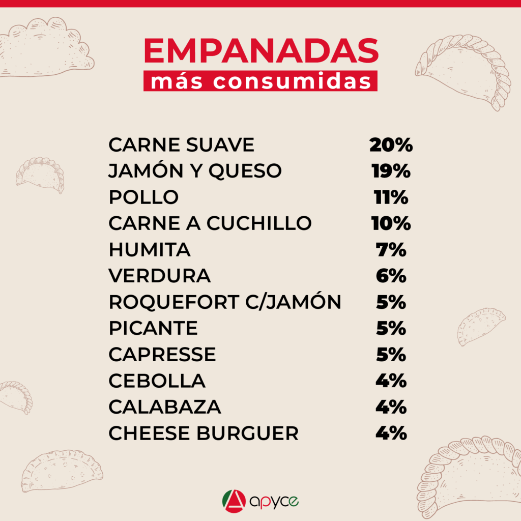 APYCE tienen sus elecciones bien marcadas. Las empanadas de «carne suave» se coronan en el primer lugar del podio con un 20% de preferencia, seguidas de cerca por las de «jamón y queso» en segundo lugar con un 19% (una mínima diferencia).