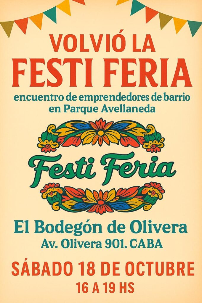 El Bodegon de Olivera, el bodegón que se encuentra en el corazón de Parque Avellaneda, organiza su famosa “Festi Feria”. Una idea que surge del dueño del bodegón Cristian Díaz Gattuso desde el año pasado con la iniciativa de convocar a los emprendedores del barrio. El sábado 18 de octubre de 16 a 19 hs en la vereda de Olivera. Ideal para comprar regalos para mamá, buenos precios y rica comida. El domingo está abierto para ir a almorzar o cenar. Olivera, abre de miércoles a domingo, de 12 del mediodía hasta la 1 de la mañana. Populacha abre sus puertas a las 19 horas, los sábados el cierre se puede extender. Av. Olivera 901. Instagram: @olivera.ar