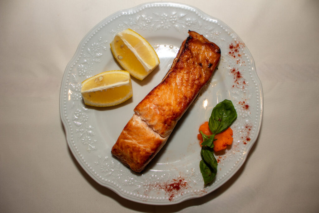 – Trucha patagónica a la crema de langostinos con papas al natural