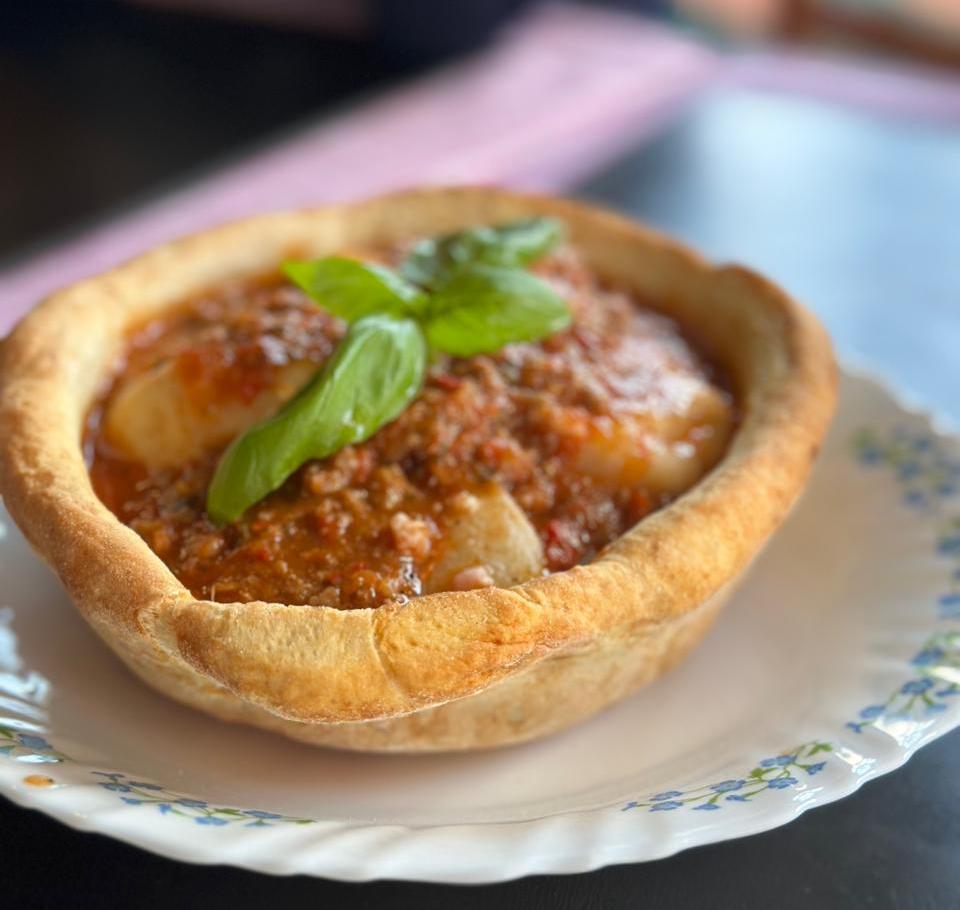 Plato destacado: Sorrentinos de vacío con salsa bolognesa en canasta de pan , se pueden elegir entre 6 salsas destacadas. Todas las pastas son caseras y se hacen en el momento. Opciones como tallarines al huevos, ravioles de verdura , sorrentinos varios y ñoquis de papa. Todos veine el su «plato» comestible.